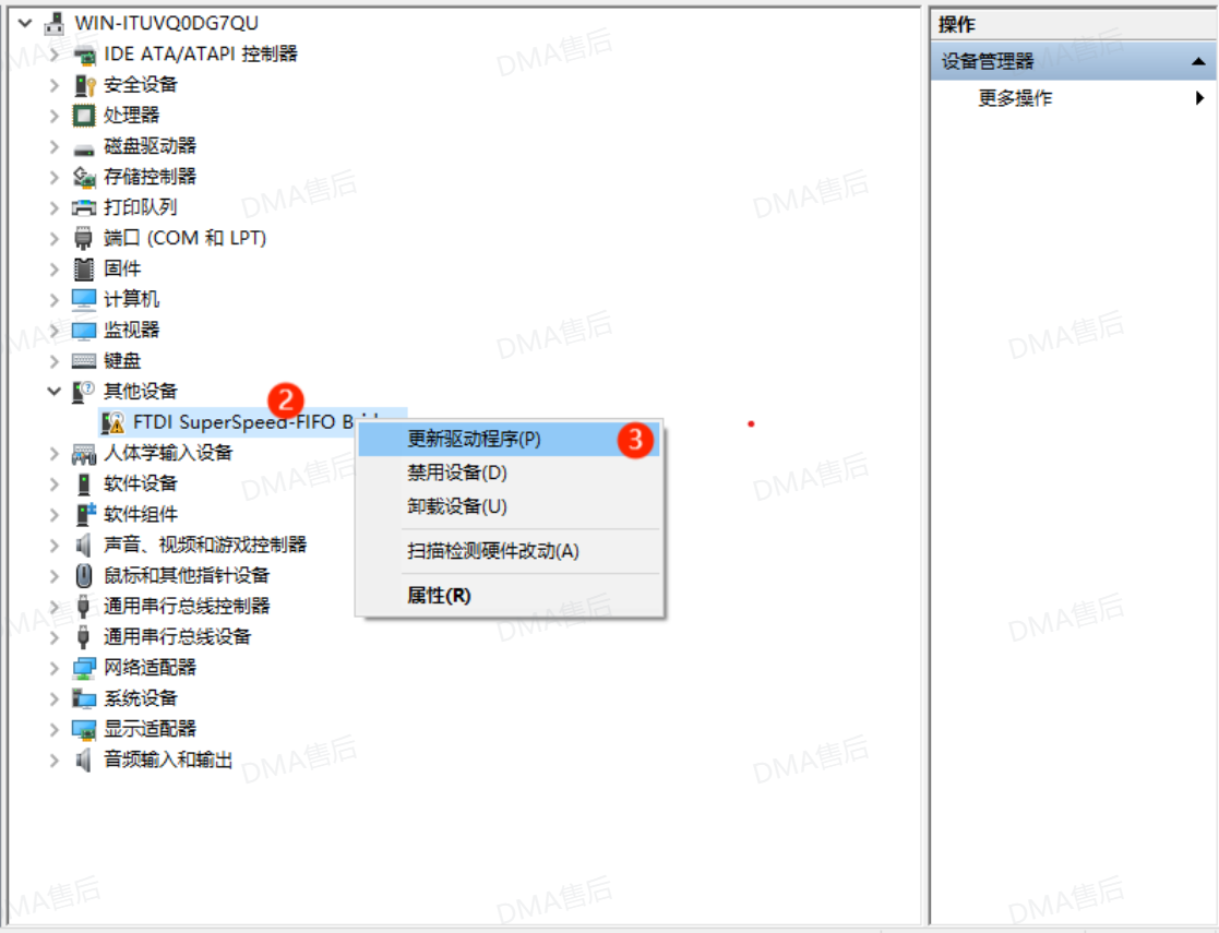 若始终未出现带黄叹号的设备,请检擦“通用串行总线控制器”内是否有一个FTDI设备,右键点击卸载后选择“尝试卸载设备驱动”,卸载完之后重新“扫描检测硬件改动”再重新打板子驱动[因为驱动软件自动将板子驱动打上了,并不适配]